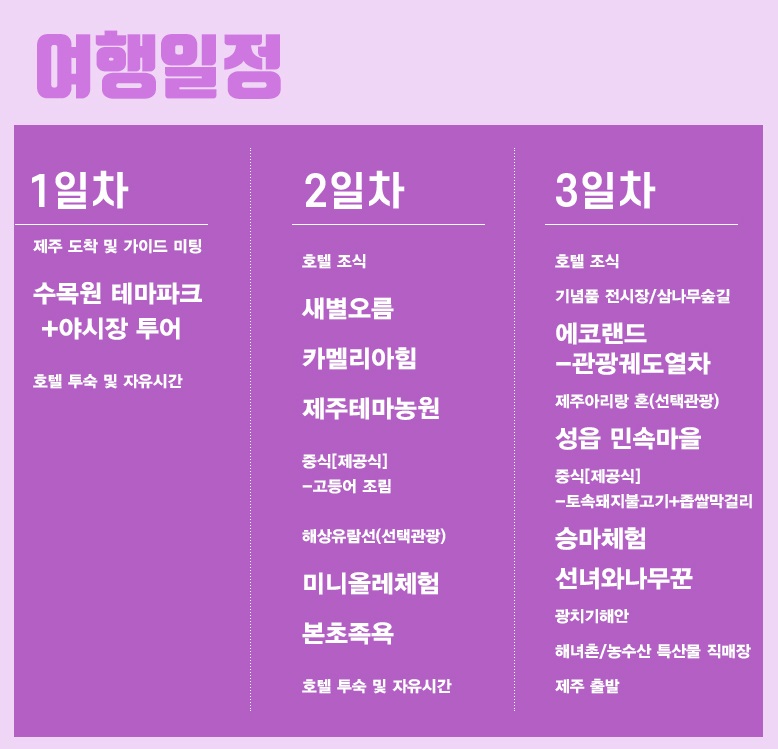 | 여행코스 | 수목원테마파크-야시장-새별오름-카멜리아힐-제주테마농원-미니올레체험-본초족욕-에코랜드-승마체험-선녀와나무꾼 |