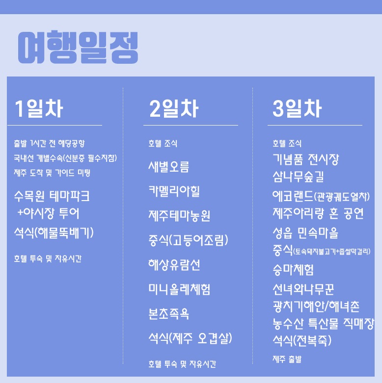 | 여행코스 | 수목원테마파크-야시장-새별오름-카멜리아힐-제주테마농원-미니올레체험-서커스월드-에코랜드-승마체험-선녀와나무꾼 |