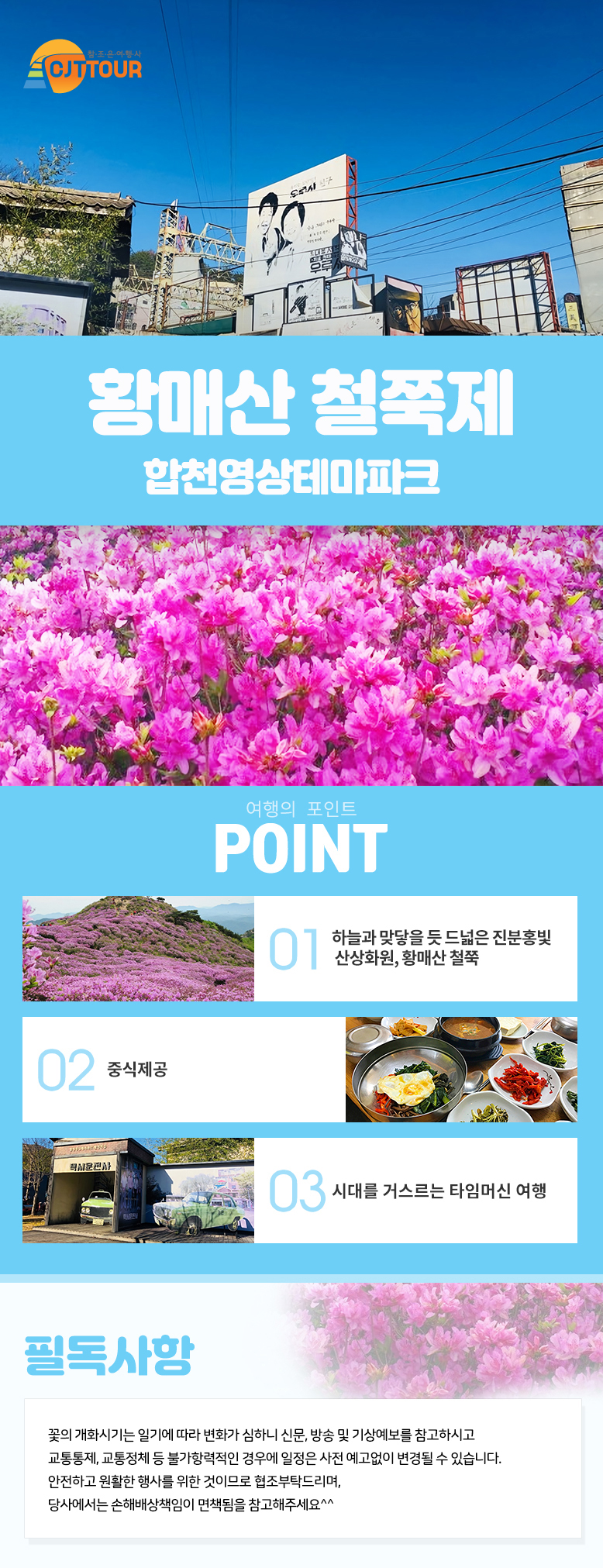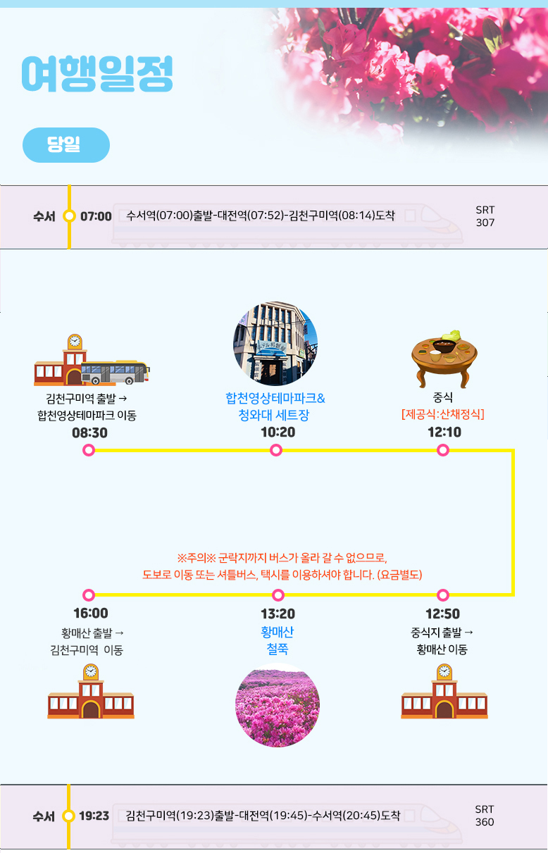 | 여행코스 | 김천구미역-합천영상테마파크-청와대 세트장-중식-황매산 철쭉군락지-김천구미역 |