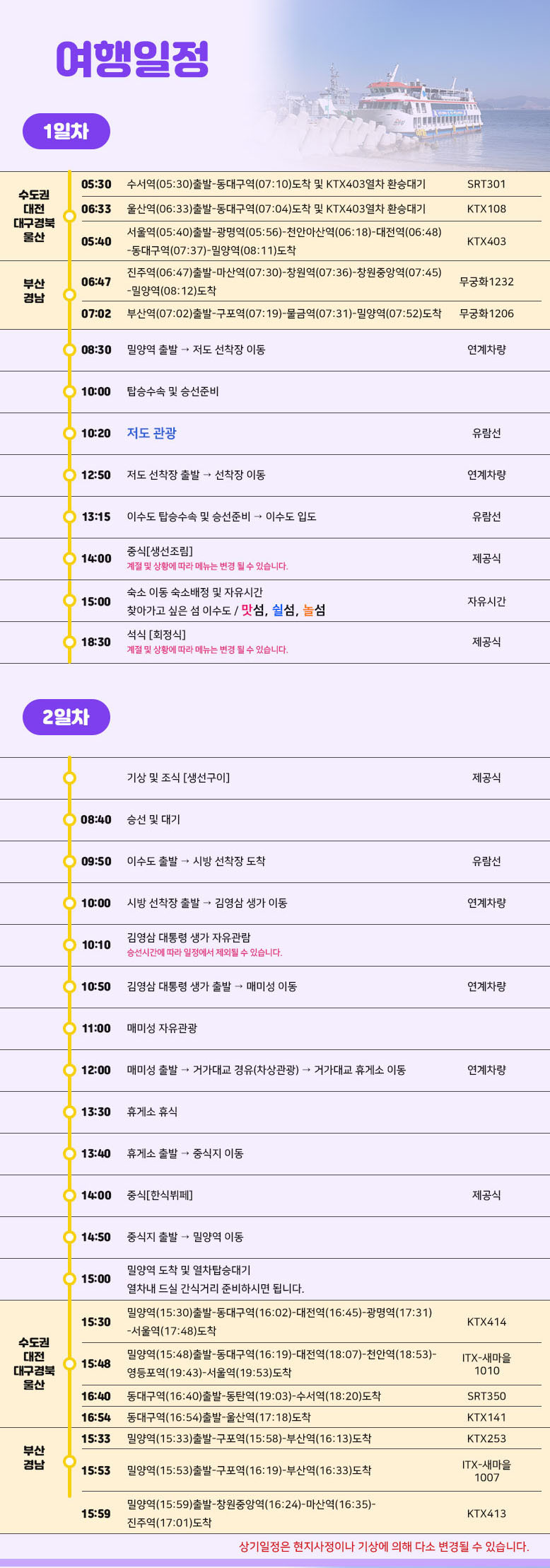 상기 일정은 열차나 천재지변 또는 현지 사정 및 도로교통 상황에 따라 변동될 수 있습니다.