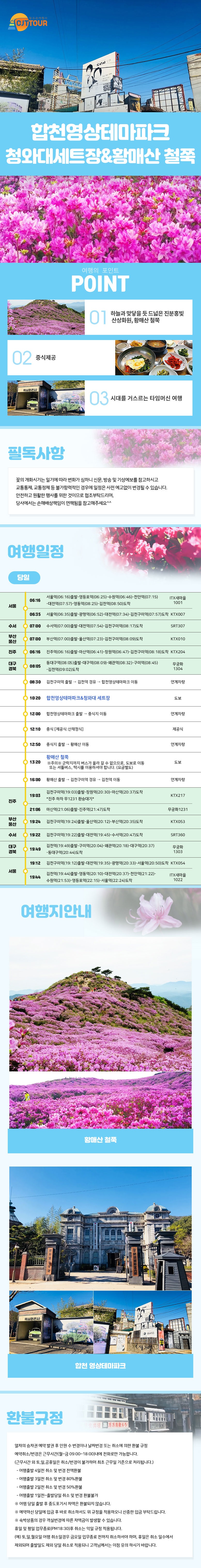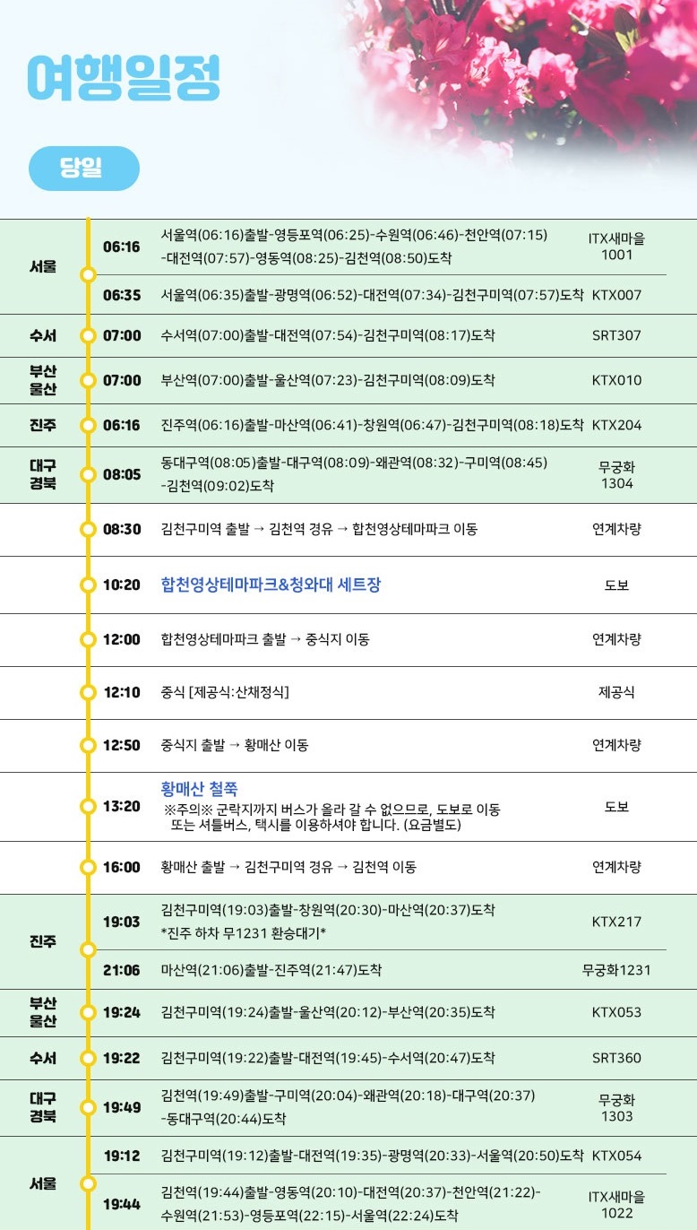 | 여행코스 | 김천역-합천영상테마파크-청와대 세트장-황매산 철쭉군락지-김천역 |