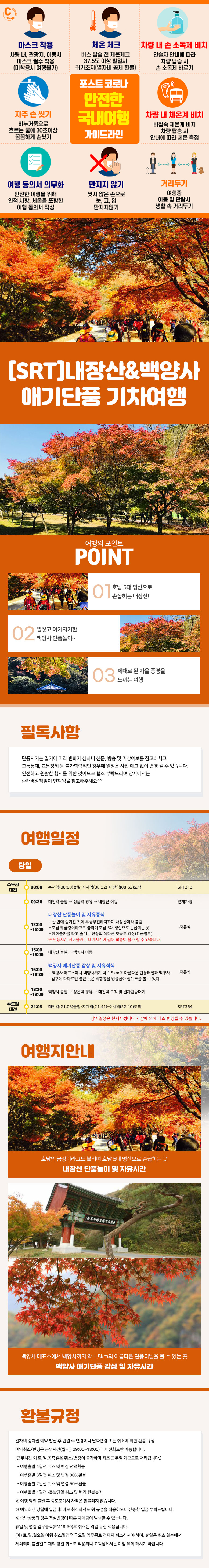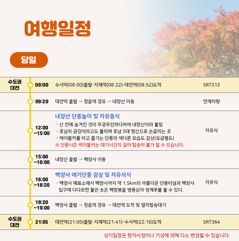 | 여행코스 | 정읍역-자유중식-내장산 단풍놀이-백양사 애기단풍 감상-자유석식-정읍역-대전역 |