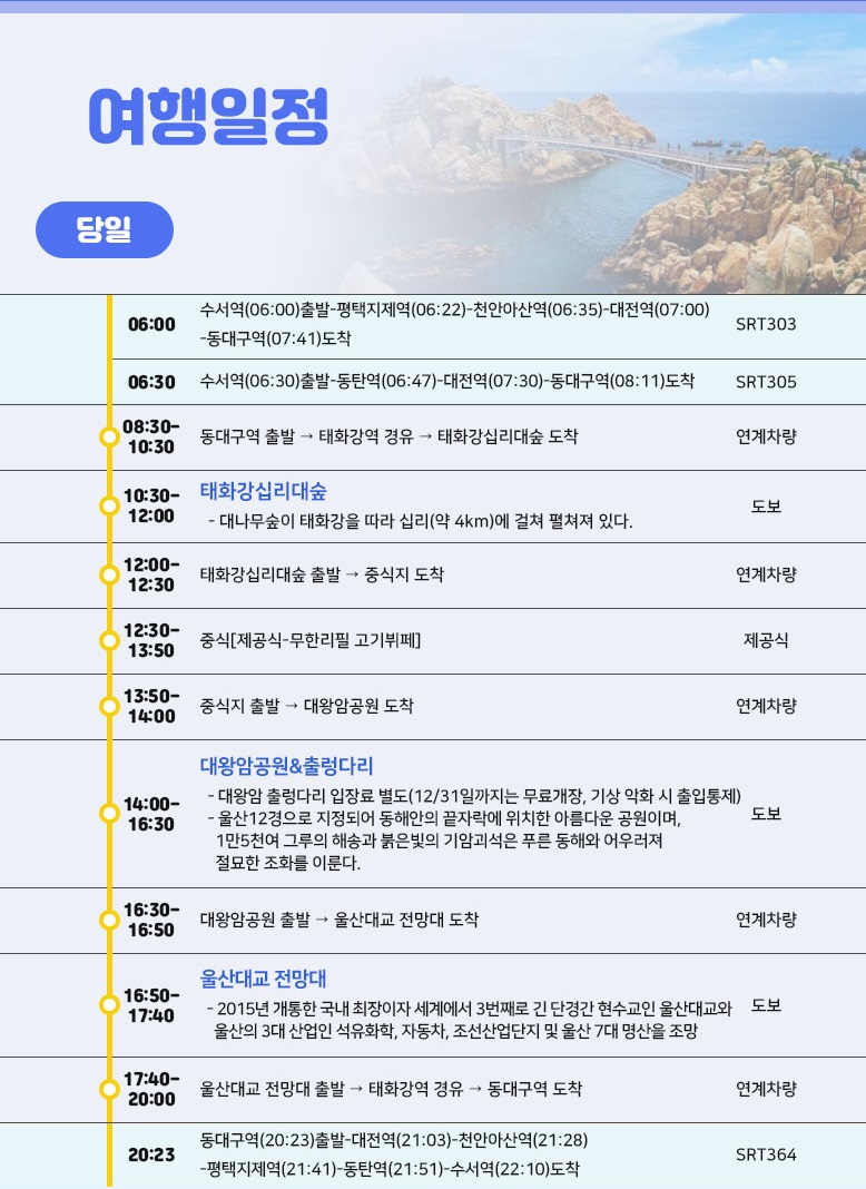 | 여행코스 | 태화강역-태화강 십리대숲-대왕암공원&출렁다리-울산대교 전망대-태화강역 |