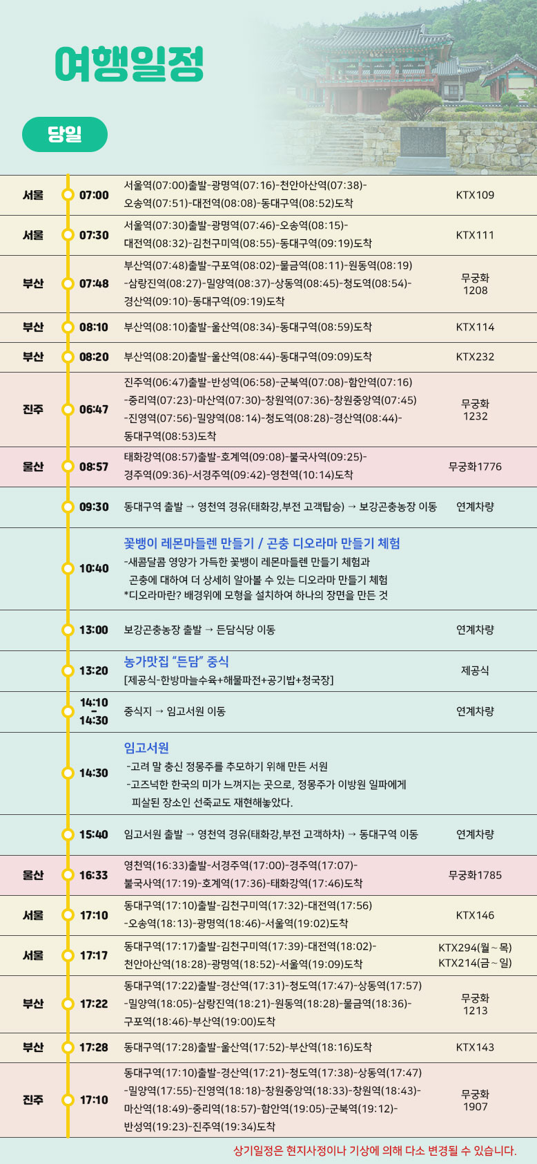상기 일정은 열차나 천재지변 또는 현지 사정 및 도로교통 상황에 따라 변동될 수 있습니다.