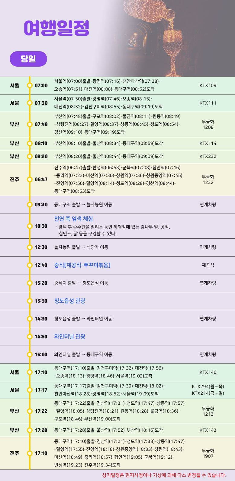 | 여행코스 | 동대구역-놀자농원-청도읍성-와인터널-동대구역 |