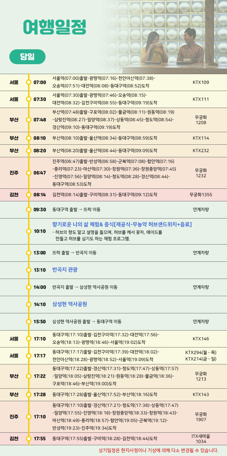 상기 일정은 열차나 천재지변 또는 현지 사정 및 도로교통 상황에 따라 변동될 수 있습니다.