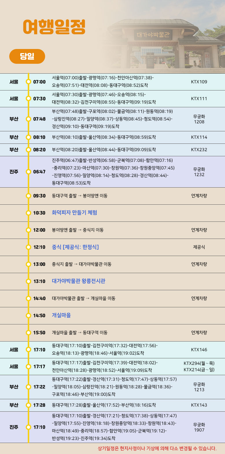상기 일정은 열차나 천재지변 또는 현지 사정 및 도로교통 상황에 따라 변동될 수 있습니다.