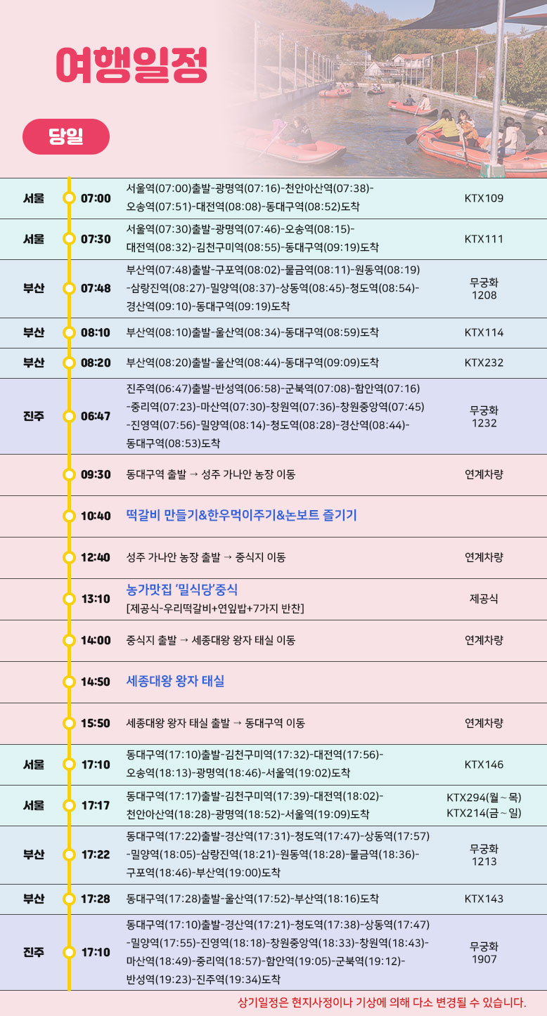 상기 일정은 열차나 천재지변 또는 현지 사정 및 도로교통 상황에 따라 변동될 수 있습니다.