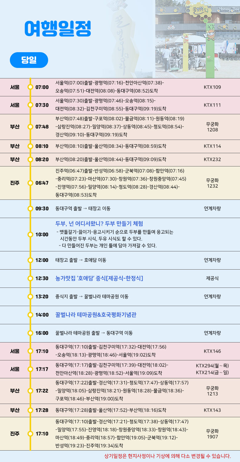 상기 일정은 열차나 천재지변 또는 현지 사정 및 도로교통 상황에 따라 변동될 수 있습니다.