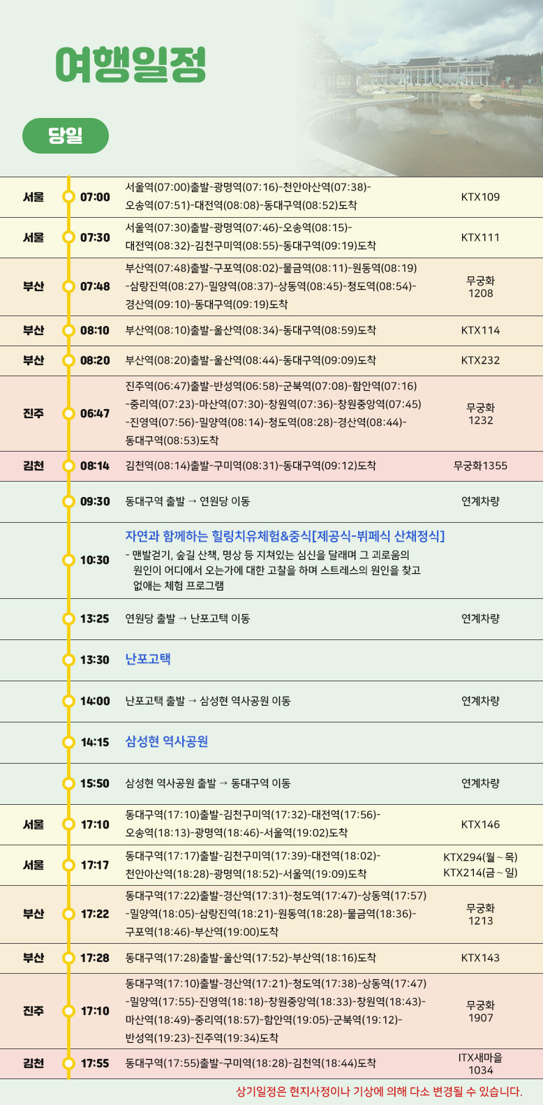 상기 일정은 열차나 천재지변 또는 현지 사정 및 도로교통 상황에 따라 변동될 수 있습니다.