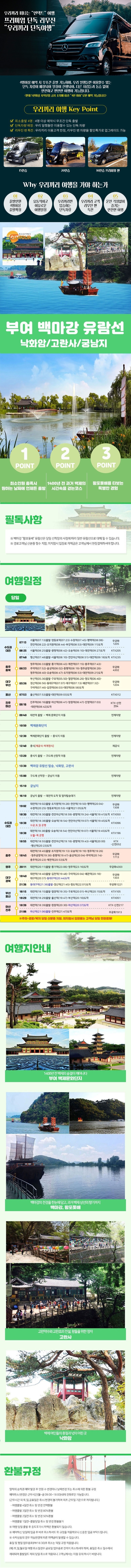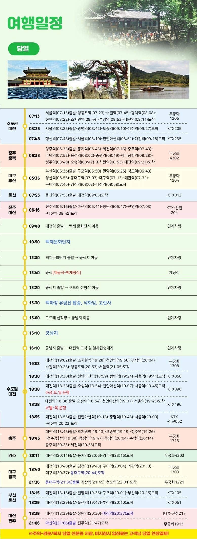 | 여행코스 | 대전역-천장호 출렁다리-백제문화단지-백마강 유람선-낙화암,고란사-궁남지-대전역 |