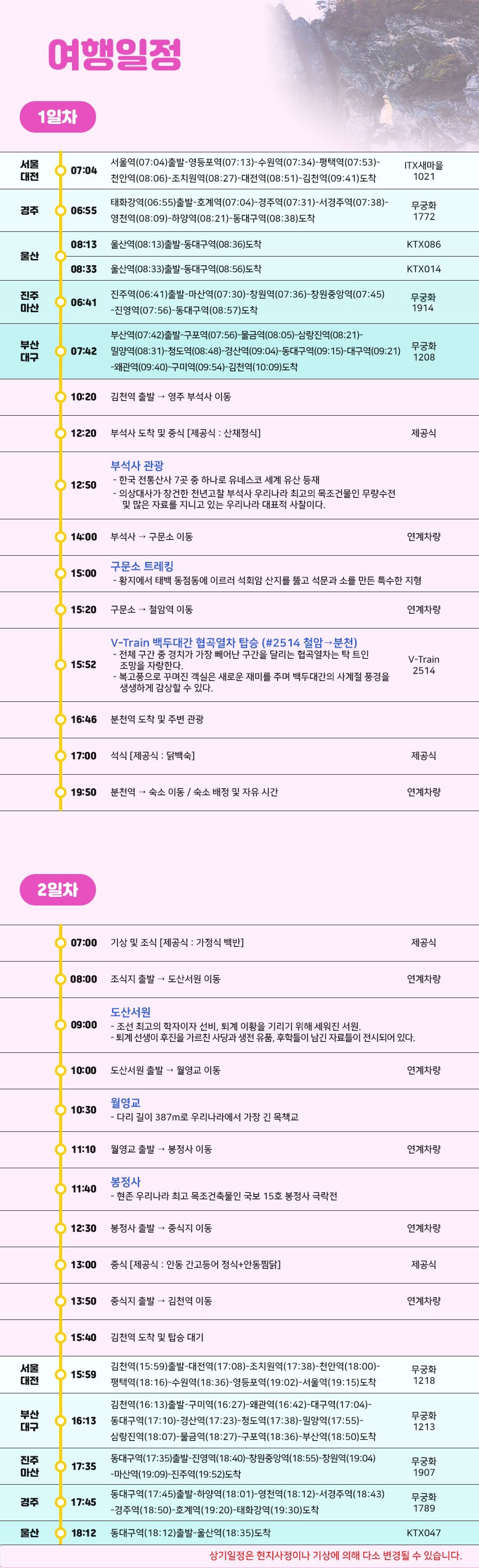 상기 일정은 열차나 천재지변 또는 현지 사정 및 도로교통 상황에 따라 변동될 수 있습니다.