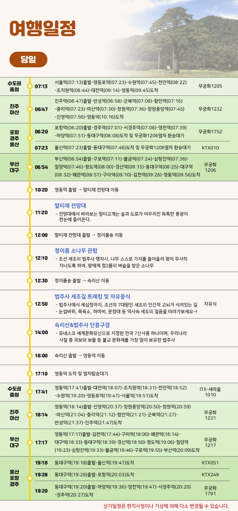 상기 일정은 열차나 천재지변 또는 현지 사정 및 도로교통 상황에 따라 변동될 수 있습니다.