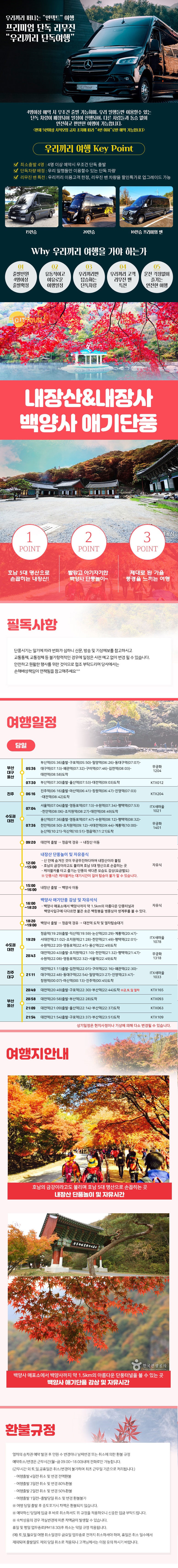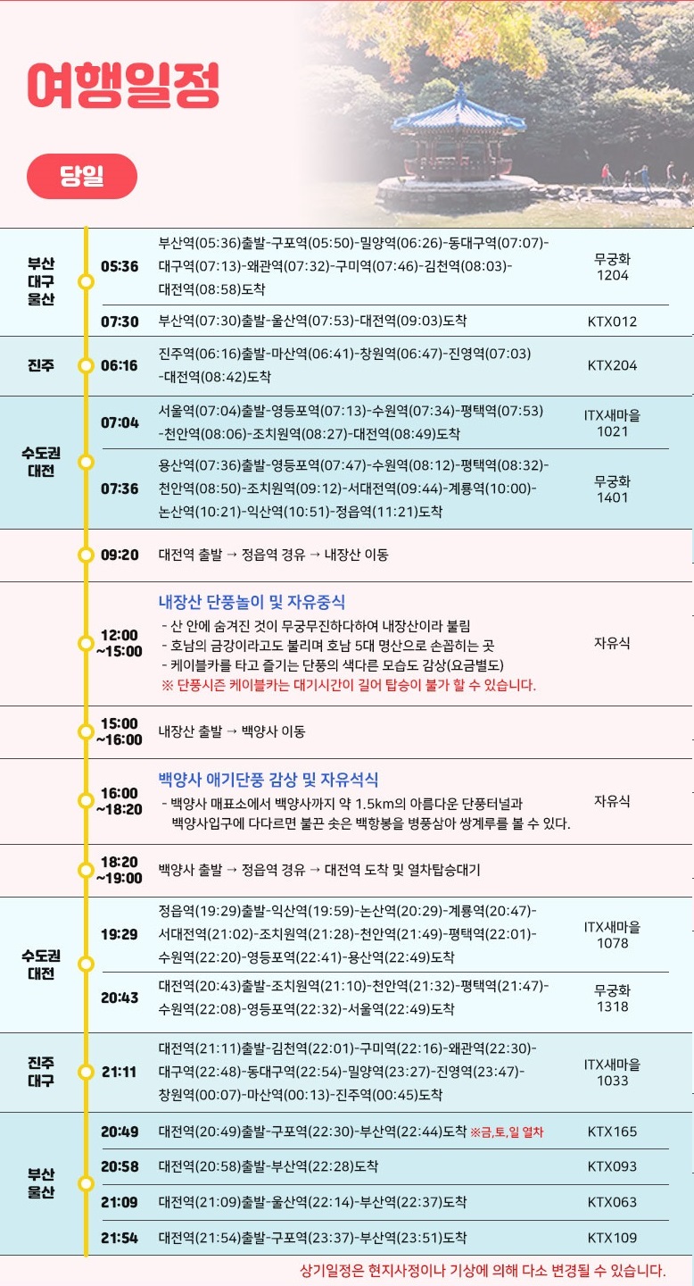 | 여행코스 | 정읍역-자유중식-내장산 단풍놀이-백양사 애기단풍 감상-자유석식-정읍역-대전역 |