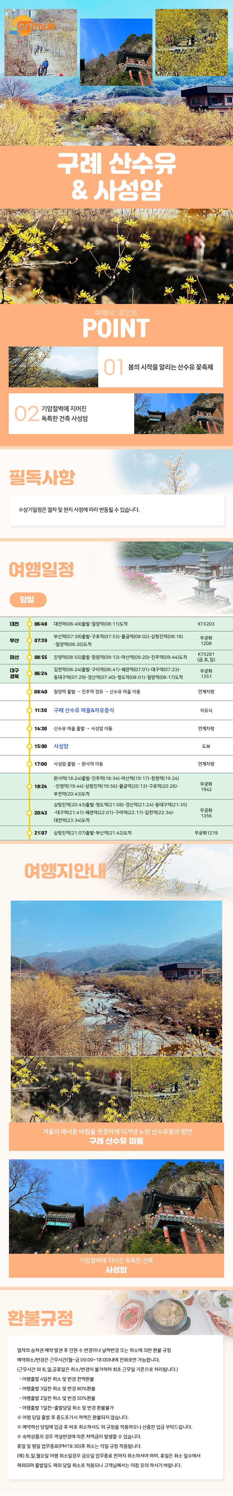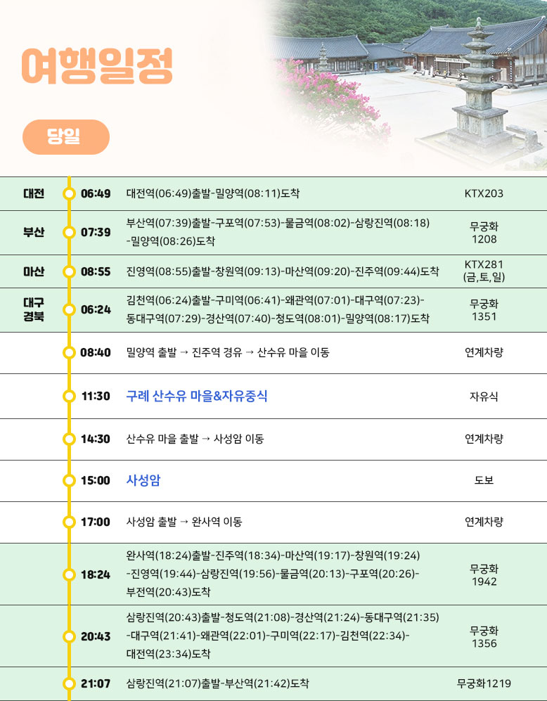 | 여행코스 | 밀양역-진주역-구례 산수유 마을-사성암-완사역 |