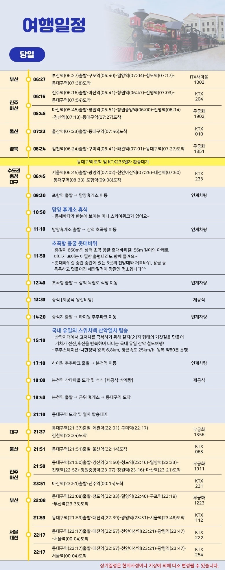 상기 일정은 열차나 천재지변 또는 현지 사정 및 도로교통 상황에 따라 변동될 수 있습니다.