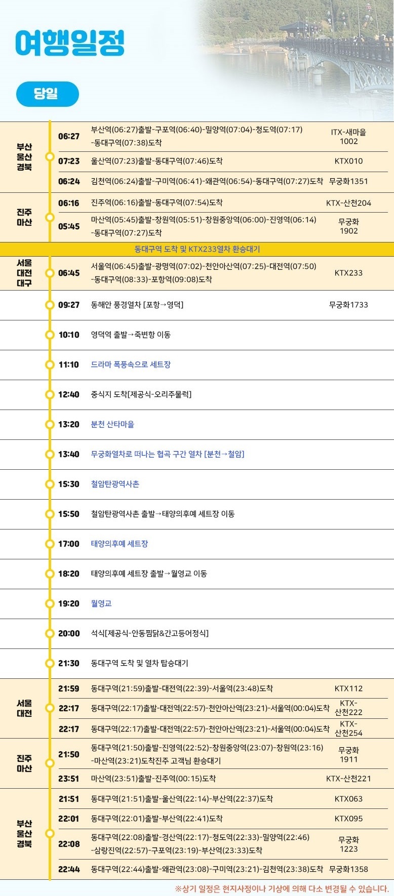상기 일정은 열차나 천재지변 또는 현지 사정 및 도로교통 상황에 따라 사전 예고 없이 변경 될 수 있습니다.