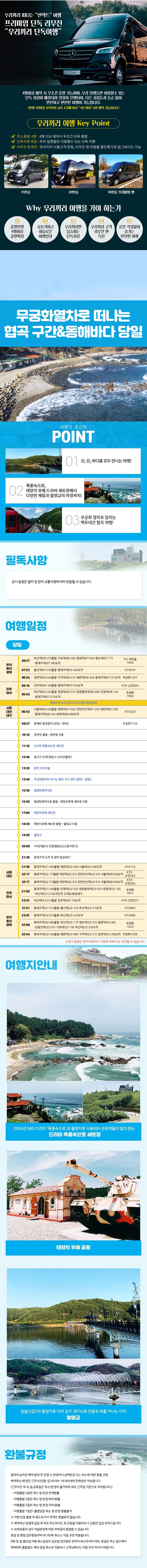 | 여행코스 | 포항역-영덕대게열차-영덕역-폭풍속으로세트장-태양의후예공원-철암역-무궁화열차로 떠나는 협곡 구간-월영교-동대구역 |