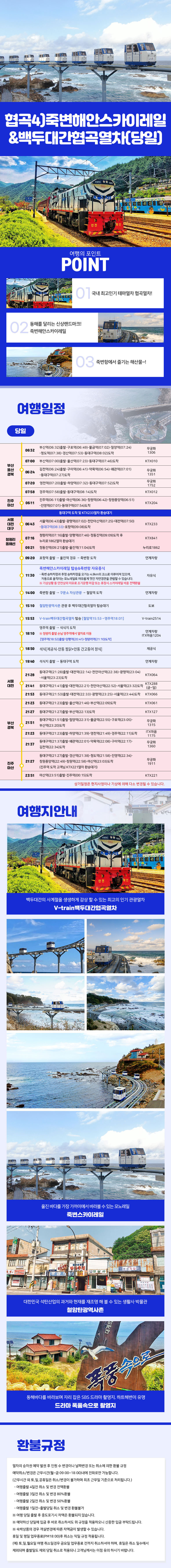 | 여행코스 | 포항역-죽변해안스카이레일-죽변항/드라마 폭풍속으로 촬영지-V-train백두대간협곡열차-철암탄광역사촌-영주역-동대구역 |