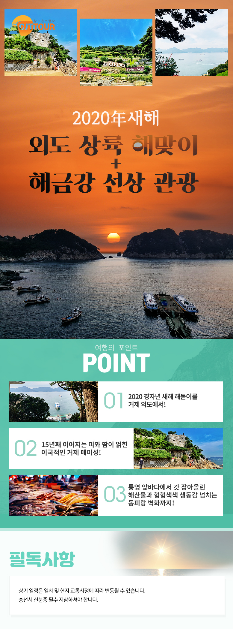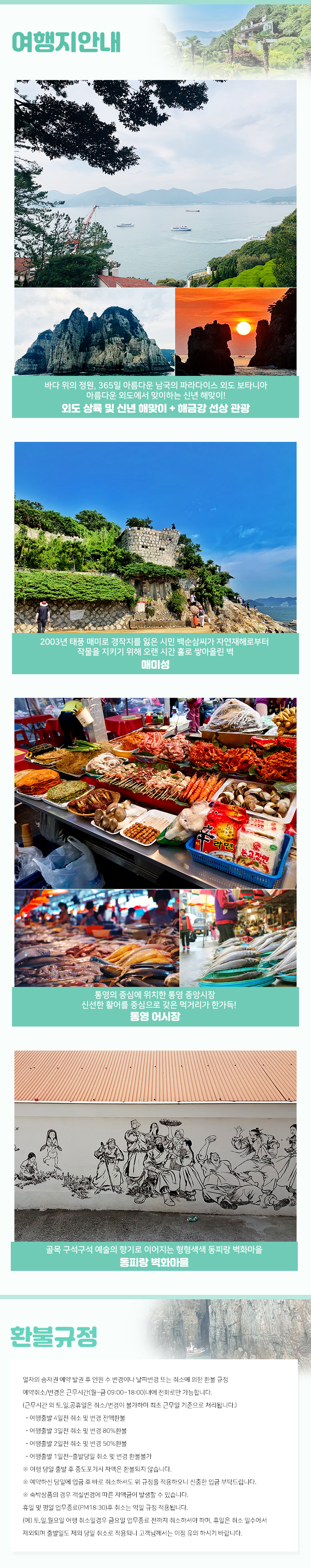| 여행코스 | 밀양역-가덕휴게소-조식-크루즈 탑승-외도 상륙-해금강 선상 관광-매미성-통영 어시장-동피랑 벽화마을-진주역 |