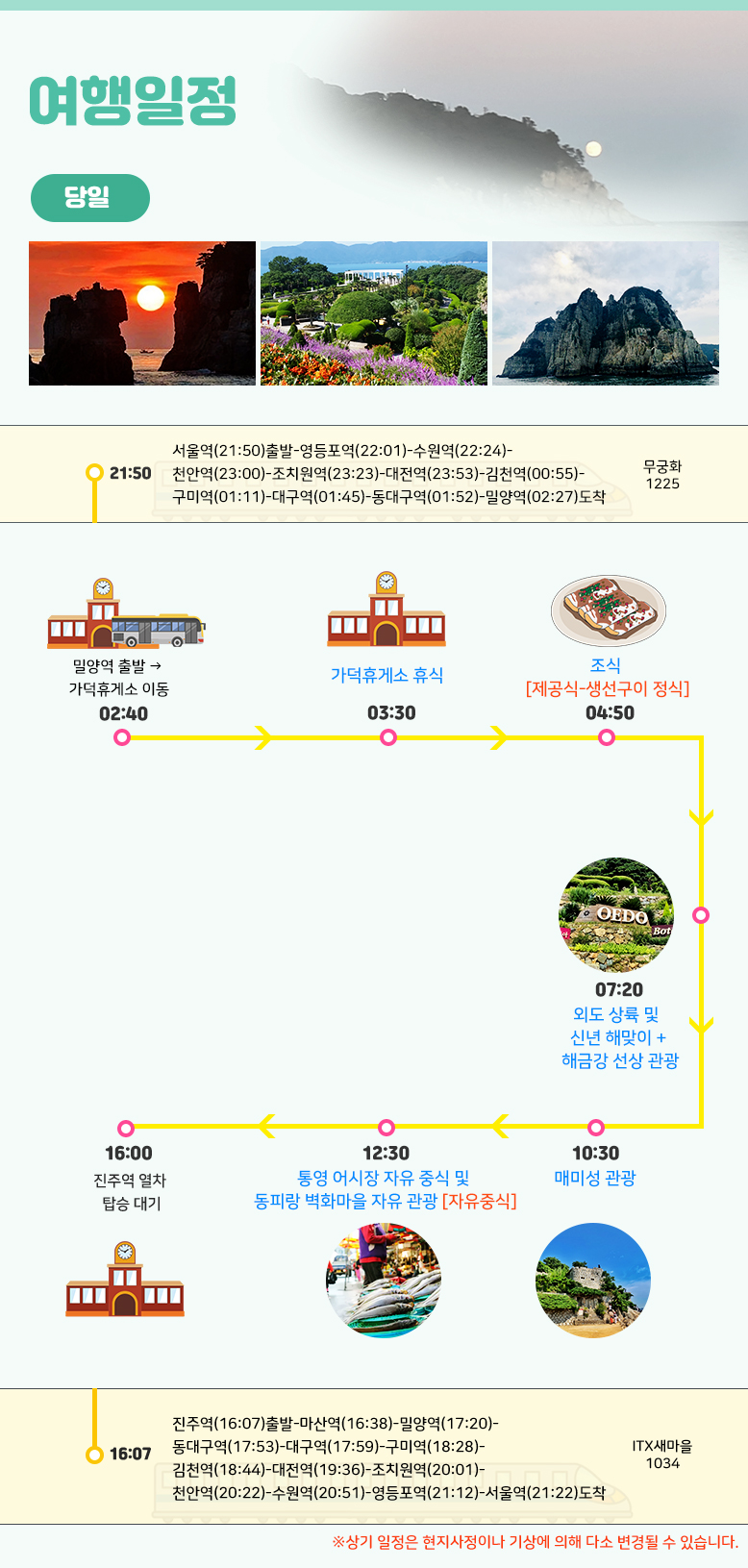상기 일정은 열차나 천재지변 또는 현지 사정 및 도로교통 상황에 따라 변동될 수 있습니다.
