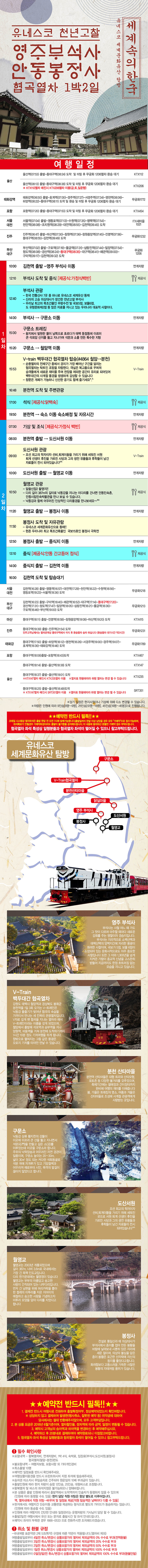 | 여행코스 | 김천역-부석사-구문소-협곡열차-분천역-도산서원-월영교-봉정사-김천역 |