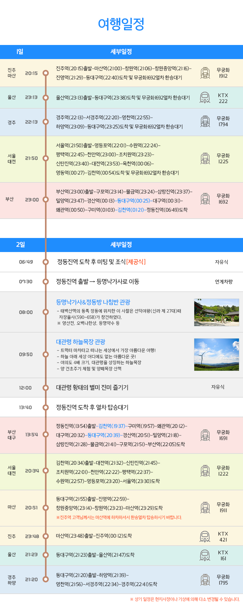 상기 일정은 열차나 천재지변 또는 현지 사정 및 도로교통 상황에 따라 변동될 수 있습니다.