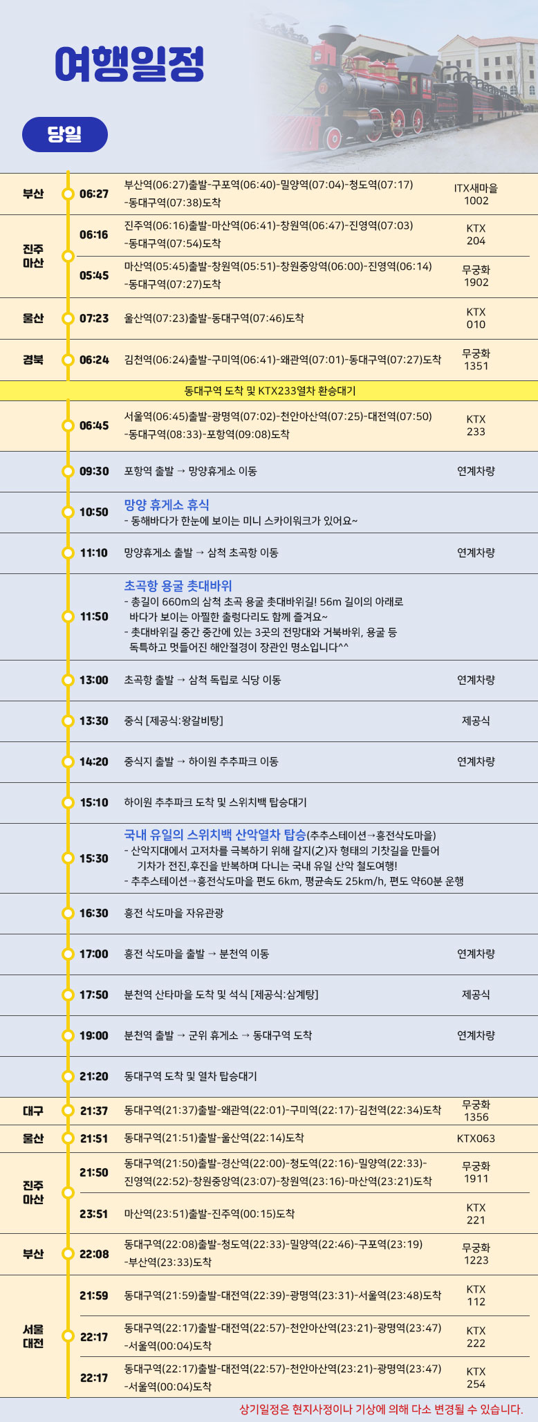 상기 일정은 열차나 천재지변 또는 현지 사정 및 도로교통 상황에 따라 변동될 수 있습니다.