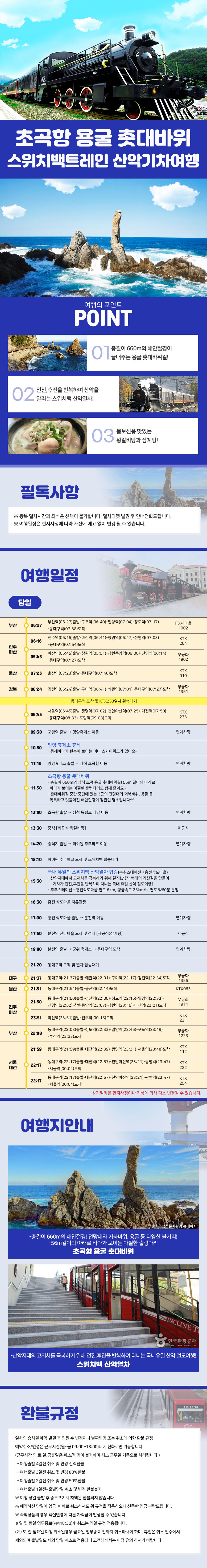 | 여행코스 | 포항역-망양휴게소-초곡항 용굴 촛대바위-하이원 추추파크-분천역-동대구역 |