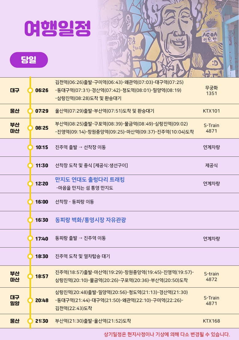 상기 일정은 열차나 천재지변 또는 현지 사정 및 도로교통 상황에 따라 변동될 수 있습니다.
