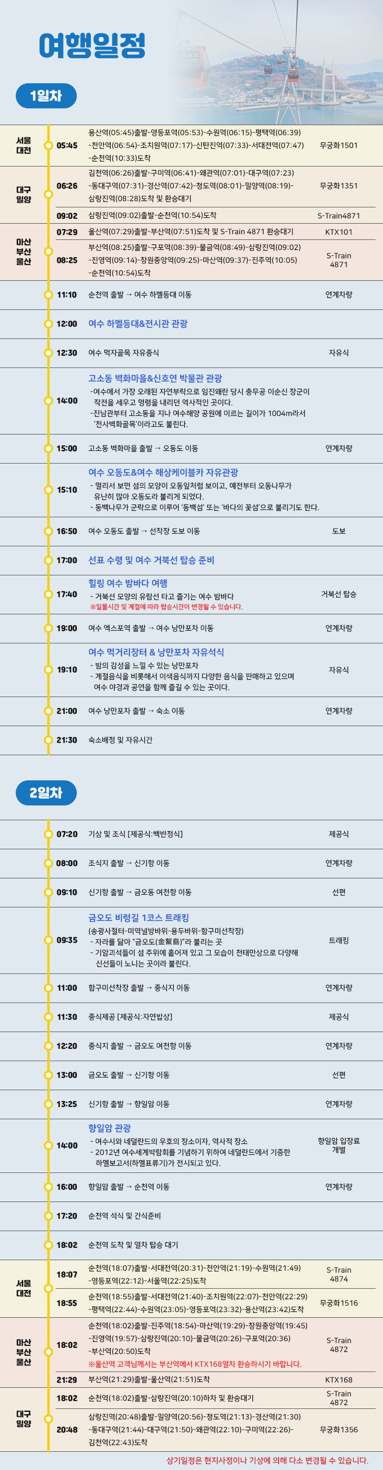 상기 일정은 열차나 천재지변 또는 현지 사정 및 도로교통 상황에 따라 변동될 수 있습니다.