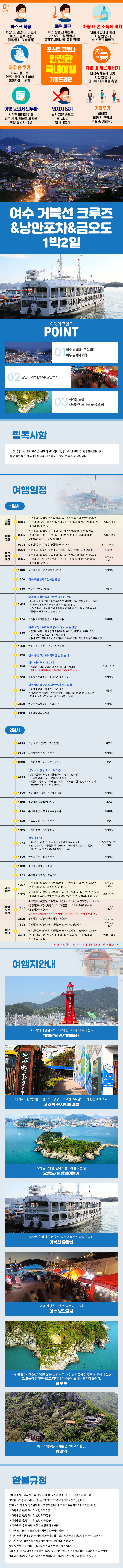 | 여행코스 | 순천역-하멜등대-고소동 벽화마을-오동도&해상케이블카-거북선 크루즈-낭만포차-금오도 비렁길-향일암-순천역 |