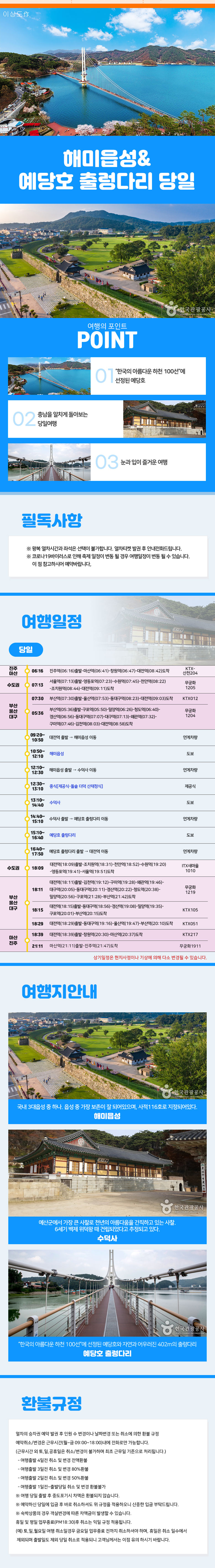 | 여행코스 | 대전역-해미읍성-수덕사-예당호출렁다리-대전역 |