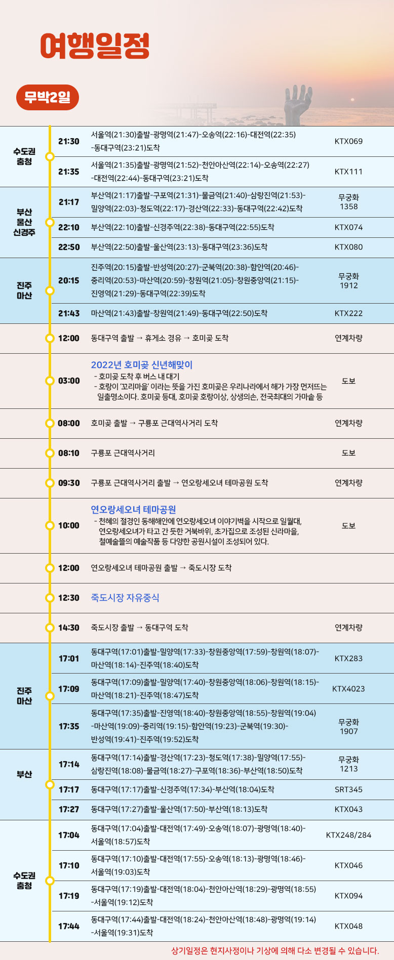 상기 일정은 열차나 천재지변 또는 현지 사정 및 도로교통 상황에 따라 변동될 수 있습니다.