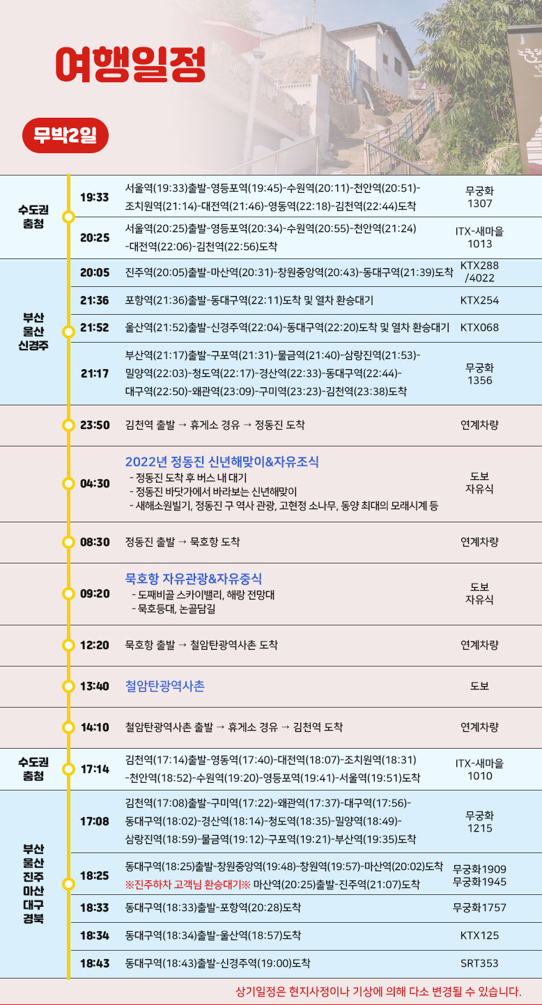 상기 일정은 열차나 천재지변 또는 현지 사정 및 도로교통 상황에 따라 변동될 수 있습니다.