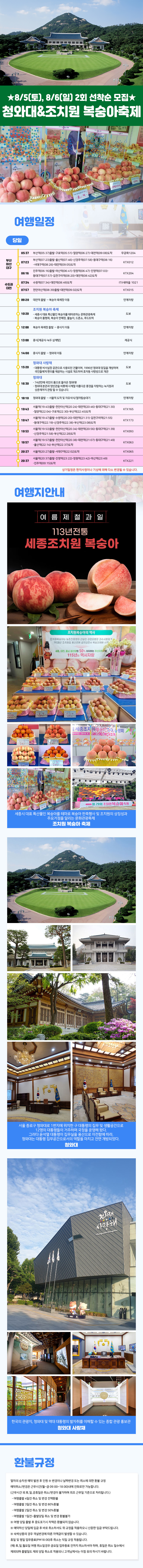 | 여행코스 | 대전역-조치원 복숭아축제-중식-청와대-서울역 |