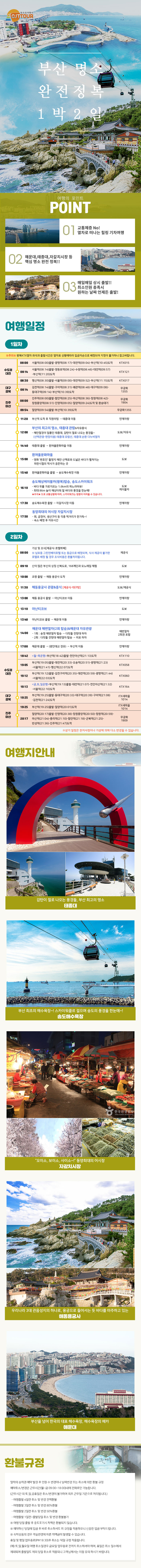 | 여행코스 | 부산역-태종대-흰여울문화마을-송대해상케이블카-자갈치시장-산복도로-해동 용궁사-아난티코브-해운대 해변열차-부산역 |