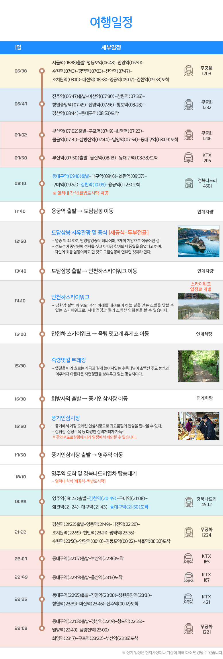상기 일정은 열차나 천재지변 또는 현지 사정 및 도로교통 상황에 따라 변동될 수 있습니다.