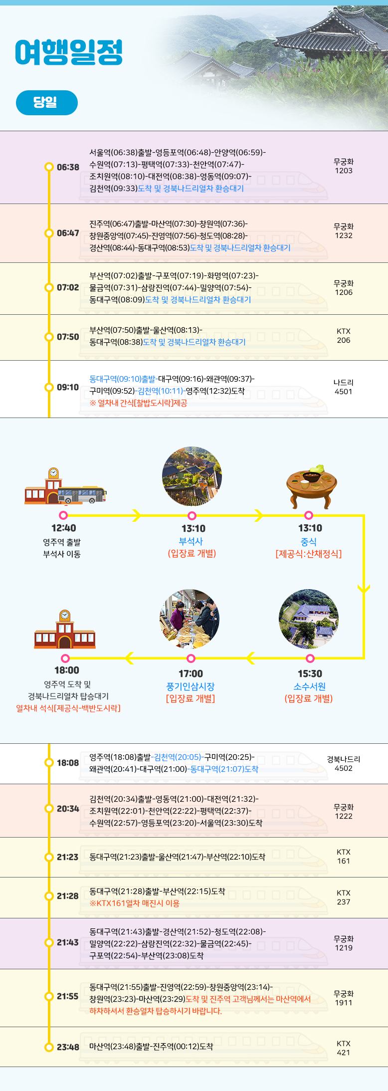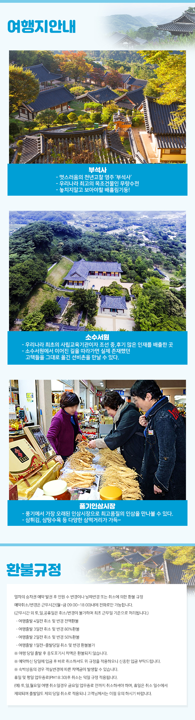 | 여행코스 | 영주역-부석사-중식[산채정식]-소수서원-풍기인삼시장-영주역 |