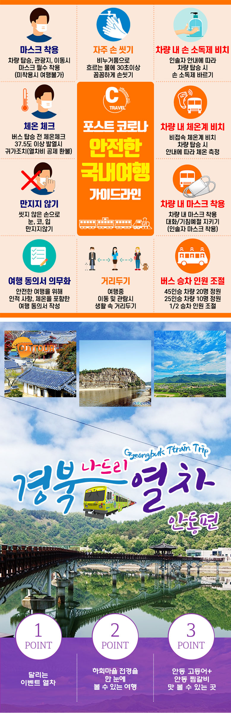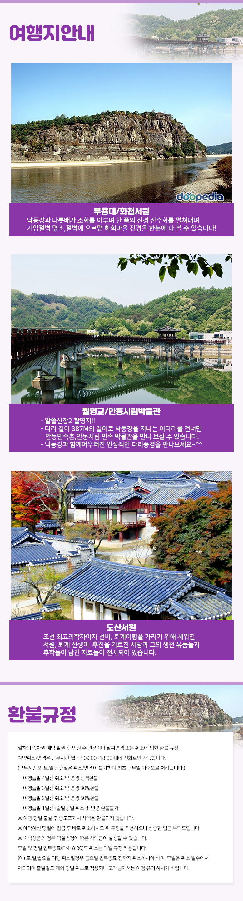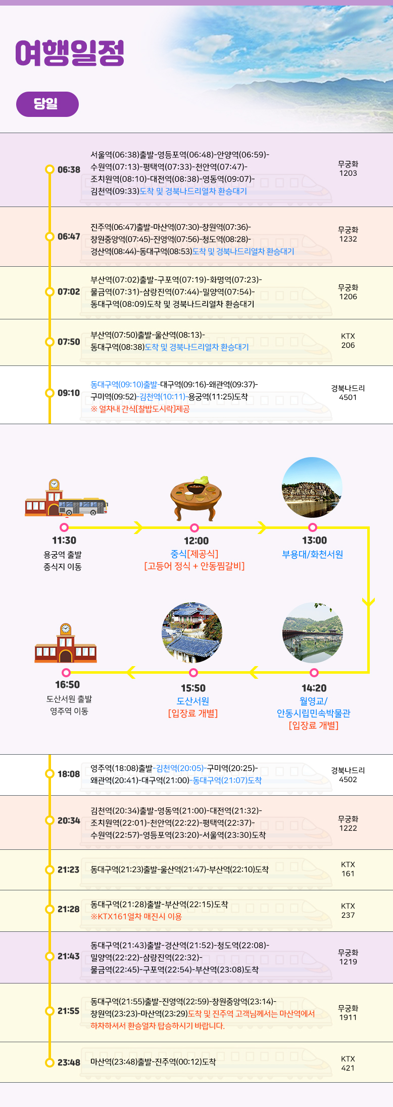 | 여행코스 | 용궁역-중식(제공식:고등어 정식+안동찜갈비)-부용대/화천서원-소수서원-월영교/안동시립민속박물관-도산서원-영주역 |