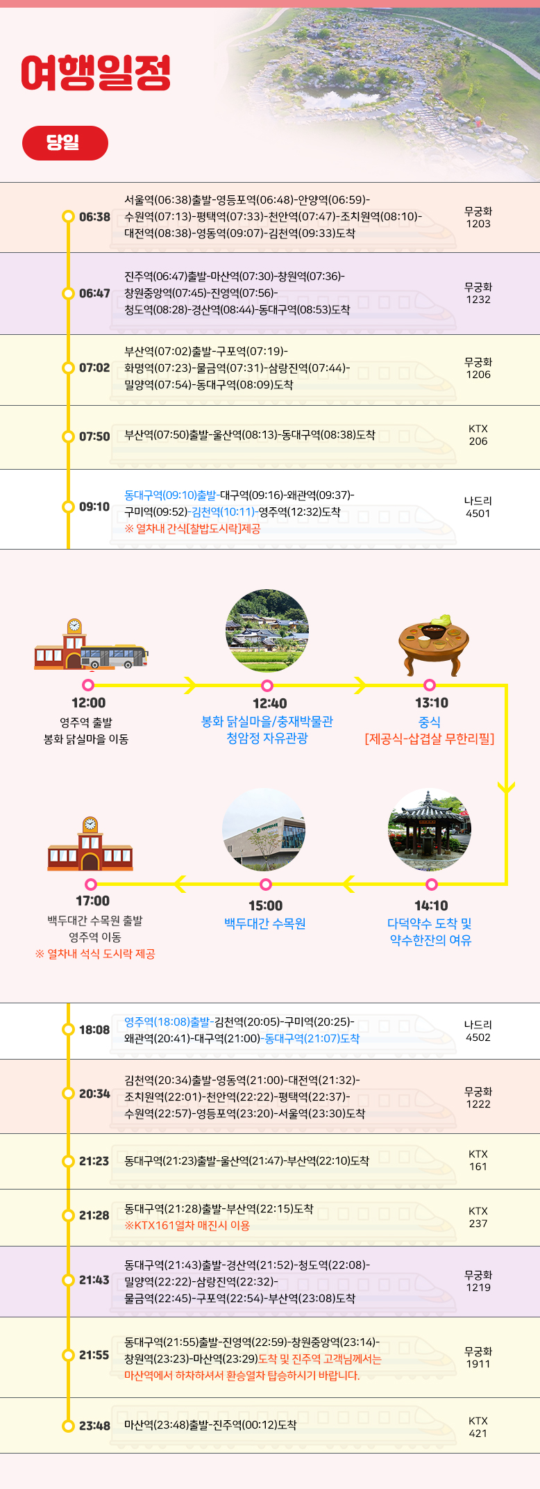 상기 일정은 열차나 천재지변 또는 현지 사정 및 도로교통 상황에 따라 변동될 수 있습니다.