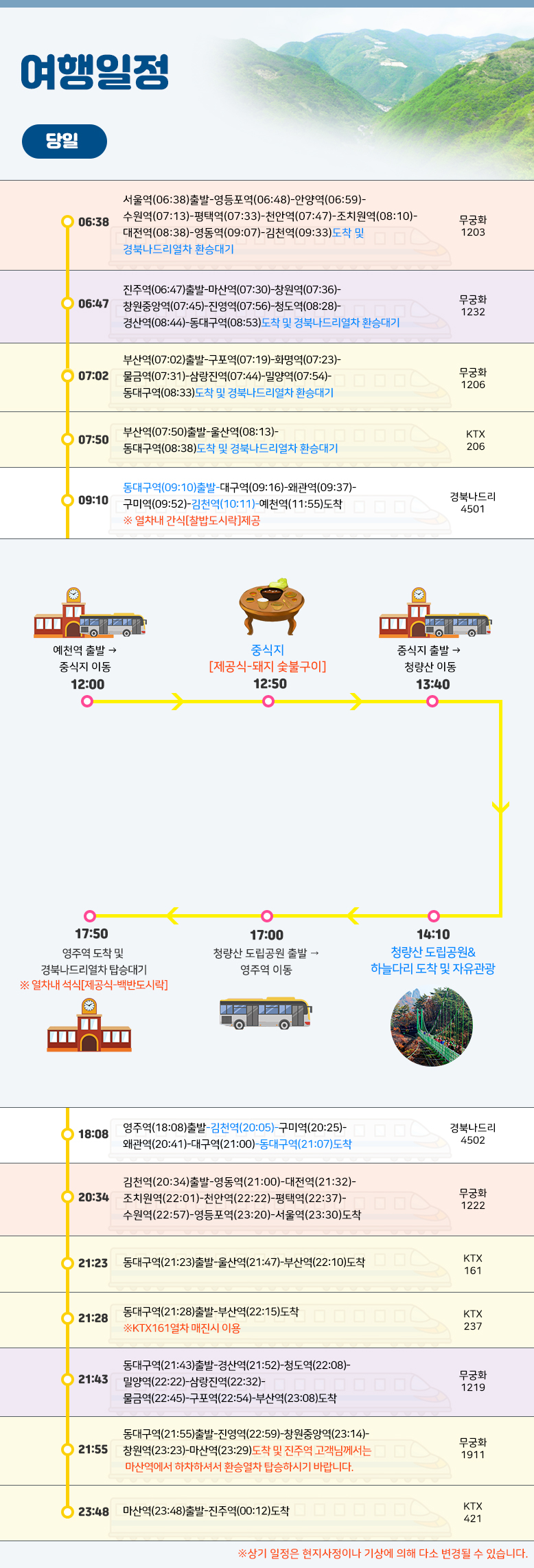 상기 일정은 열차나 천재지변 또는 현지 사정 및 도로교통 상황에 따라 변동될 수 있습니다.