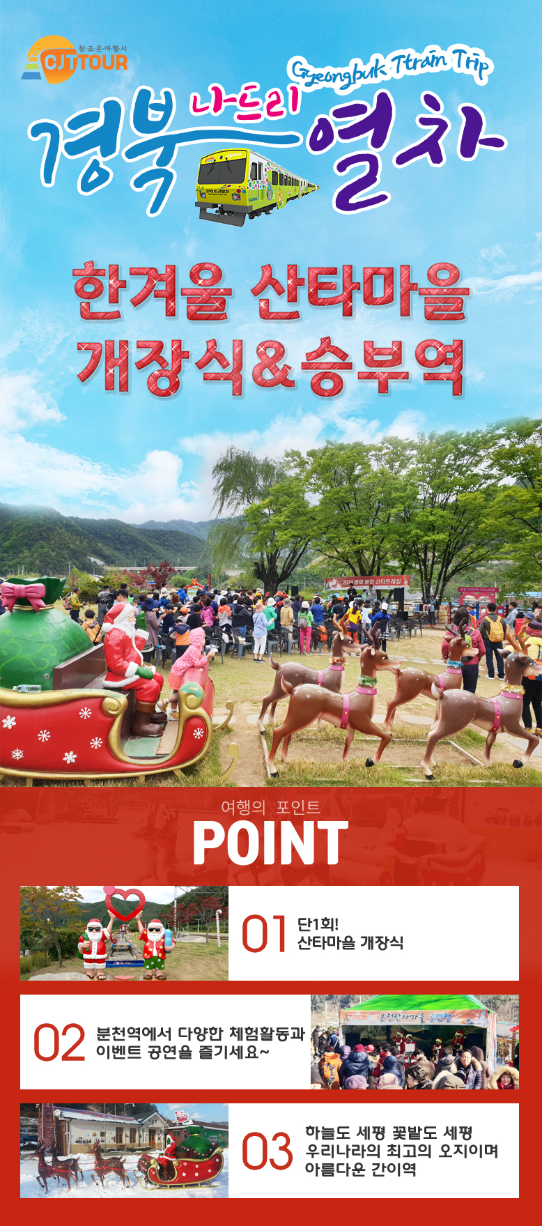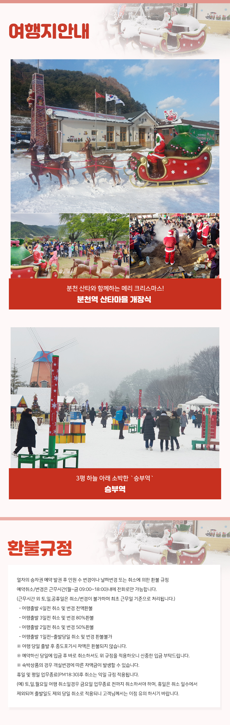 | 여행코스 | 분천역-중식지-산타마을 개장식 공연 관람-무궁화호로 즐기는 협곡구간 여행-승부역-분천산타마을-분천역 |