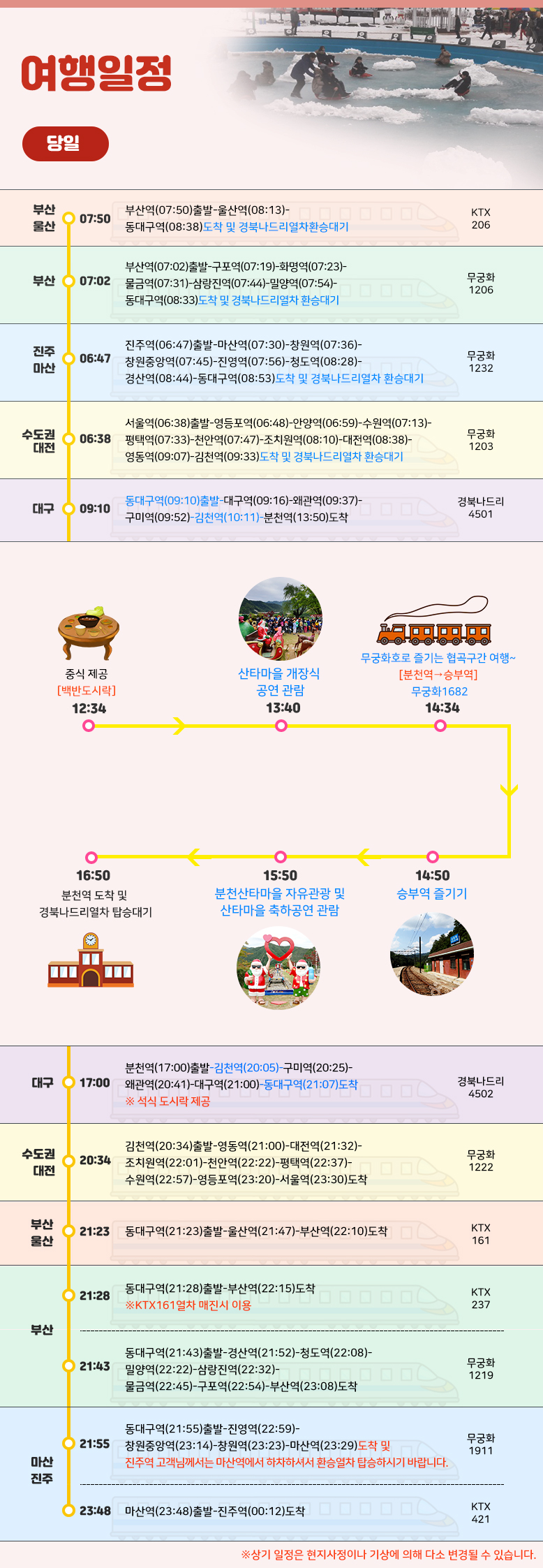 상기 일정은 열차나 천재지변 또는 현지 사정 및 도로교통 상황에 따라 변동될 수 있습니다.