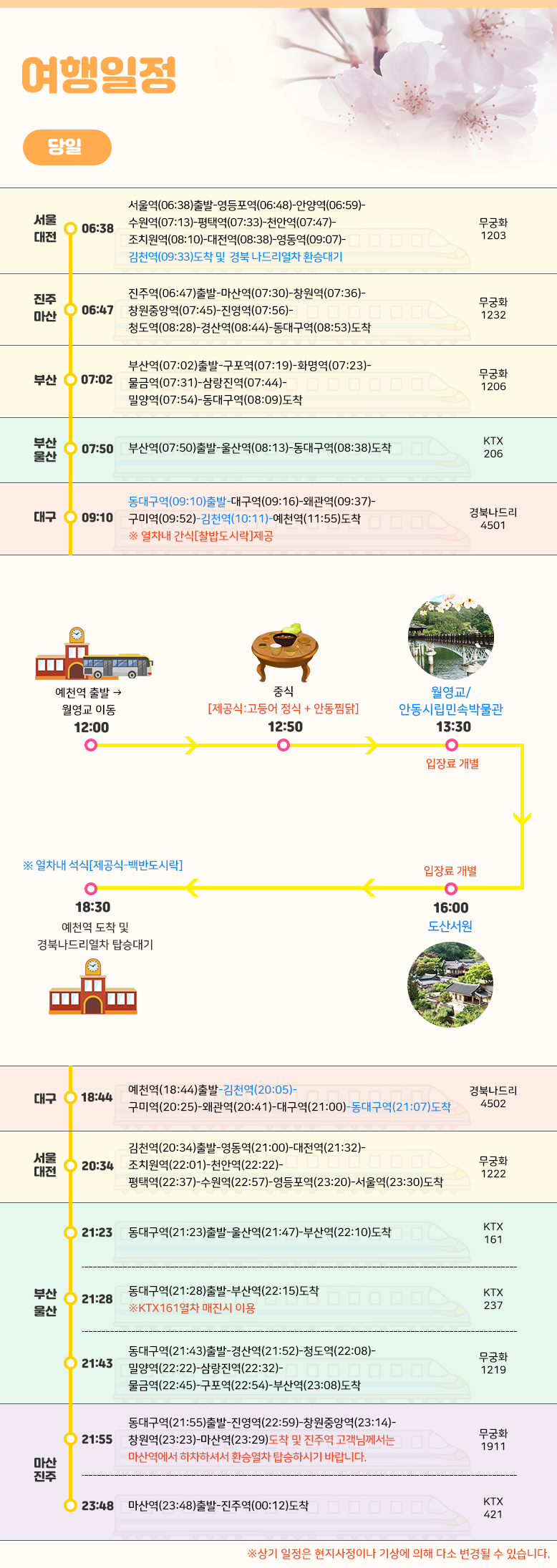 상기 일정은 열차나 천재지변 또는 현지 사정 및 도로교통 상황에 따라 변동될 수 있습니다.