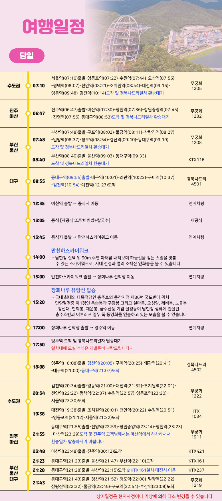 상기 일정은 열차나 천재지변 또는 현지 사정 및 도로교통 상황에 따라 변동될 수 있습니다.