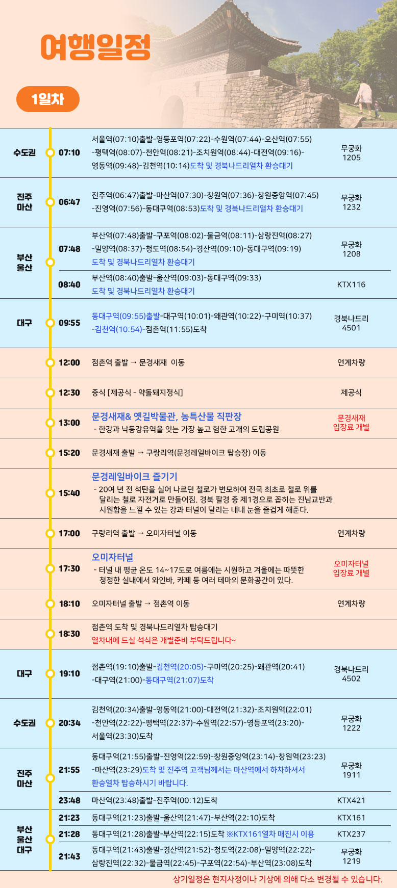 상기 일정은 열차나 천재지변 또는 현지 사정 및 도로교통 상황에 따라 변동될 수 있습니다.