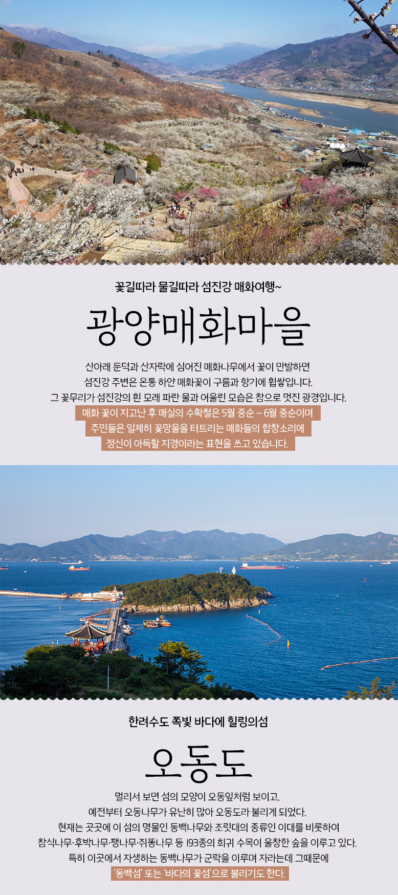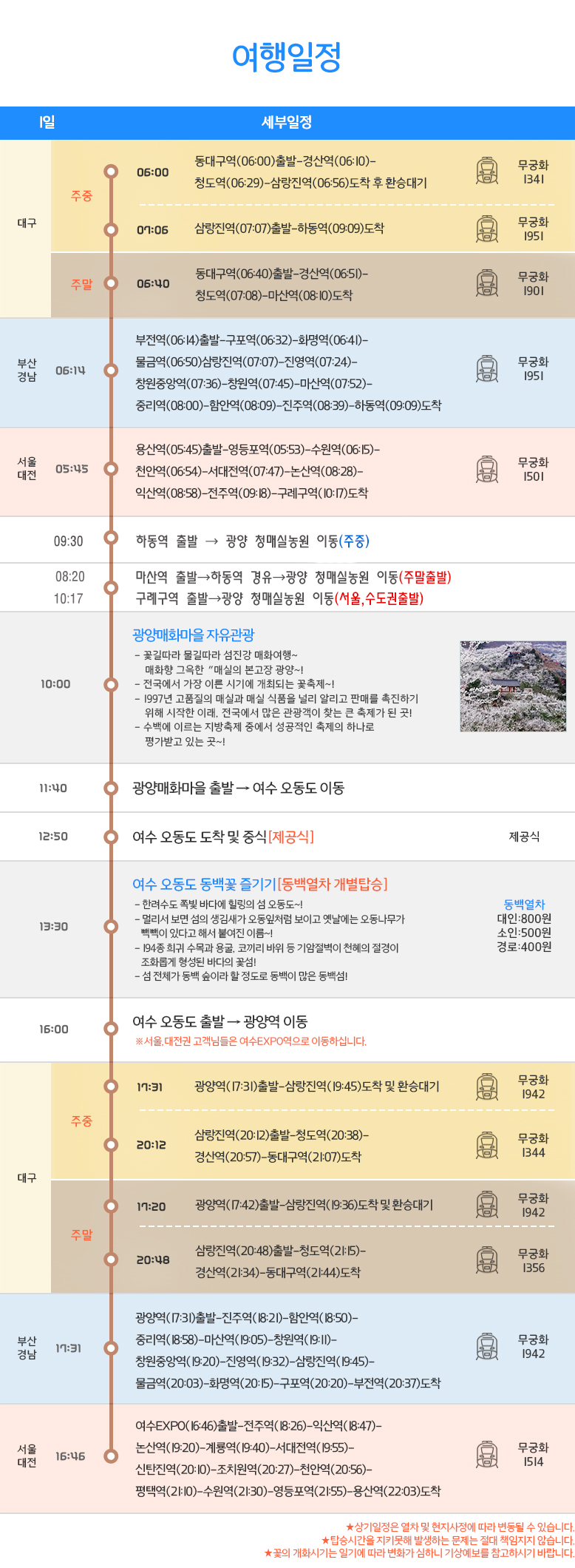 | 여행코스 | 하동역(주말 마산역)-광양매화마을 자유관광-여수 오동도-광양역 |