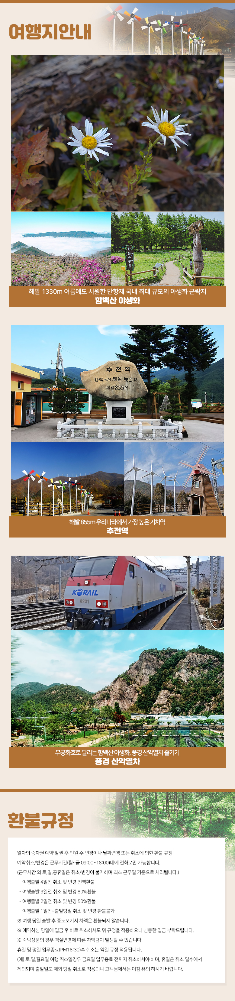 | 여행코스 | 김천역-중식-함백산 만항재-추전역-풍경산악역차 탑승-석식-제천역 |