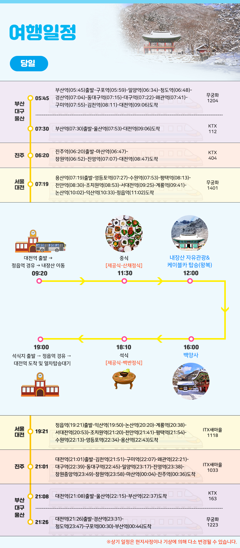상기 일정은 열차나 천재지변 또는 현지 사정 및 도로교통 상황에 따라 변동될 수 있습니다.